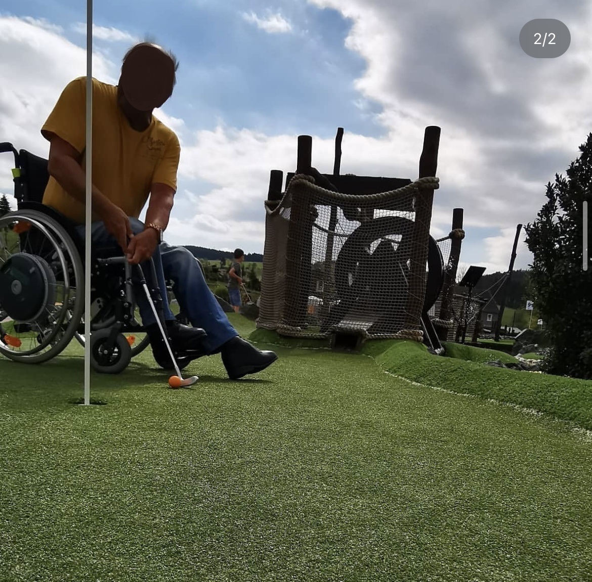 - Die Wege der Minigolfanlage sind leicht begeh- und befahrbar. Die Wegbreiten betragen mindestens 120 cm. Die Wege haben eine maximale Längsneigung von 7 % auf einer Länge von 7 m.
