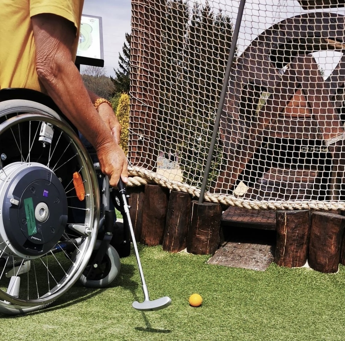 - Die Gehwegbegrenzungen der Minigolfbahnen sind visuell kontrastreich und taktil erfassbar.