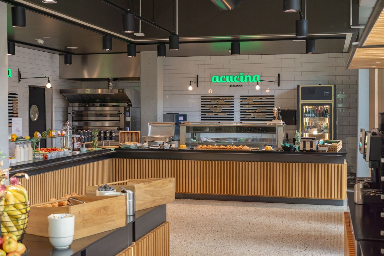 - Die Speisen im Frühstücksraum werden sichtbar präsentiert (Buffet, Theke).
