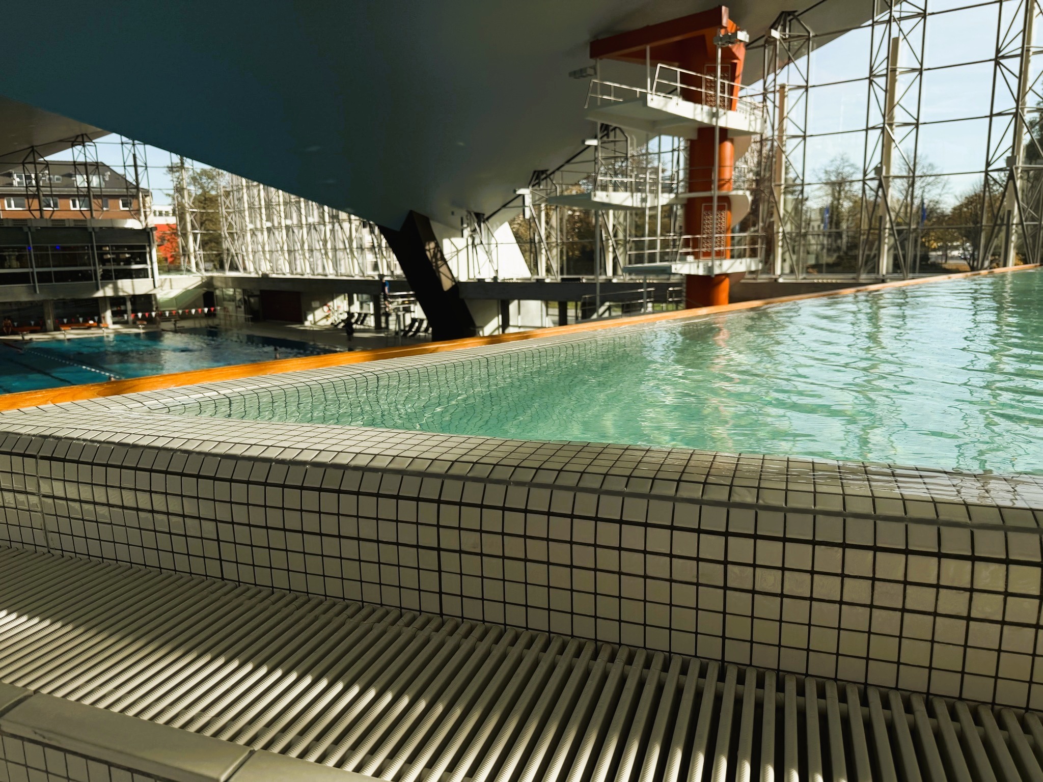 - Zum Einstieg in das Sportbecken, das Lehrschwimmbecken, das Warmschwimmbecken und das Kursbecken gibt es einen Personenlift, flache Treppenstufen mit Handlauf und eine Leiter mit Handlauf.