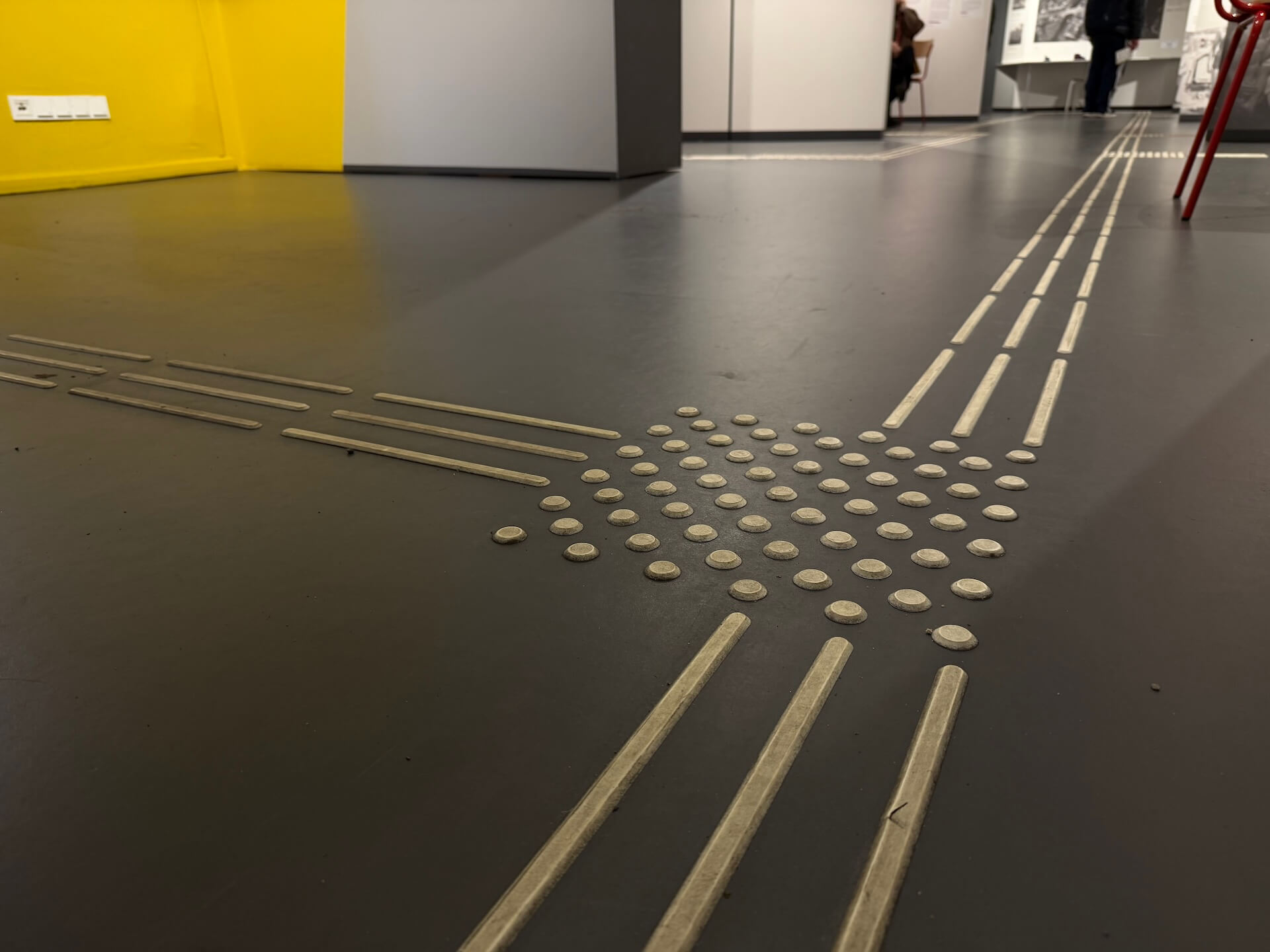 - In der Ausstellung ist ein durchgängiges Leitsystem mit Bodenindikatoren vorhanden.