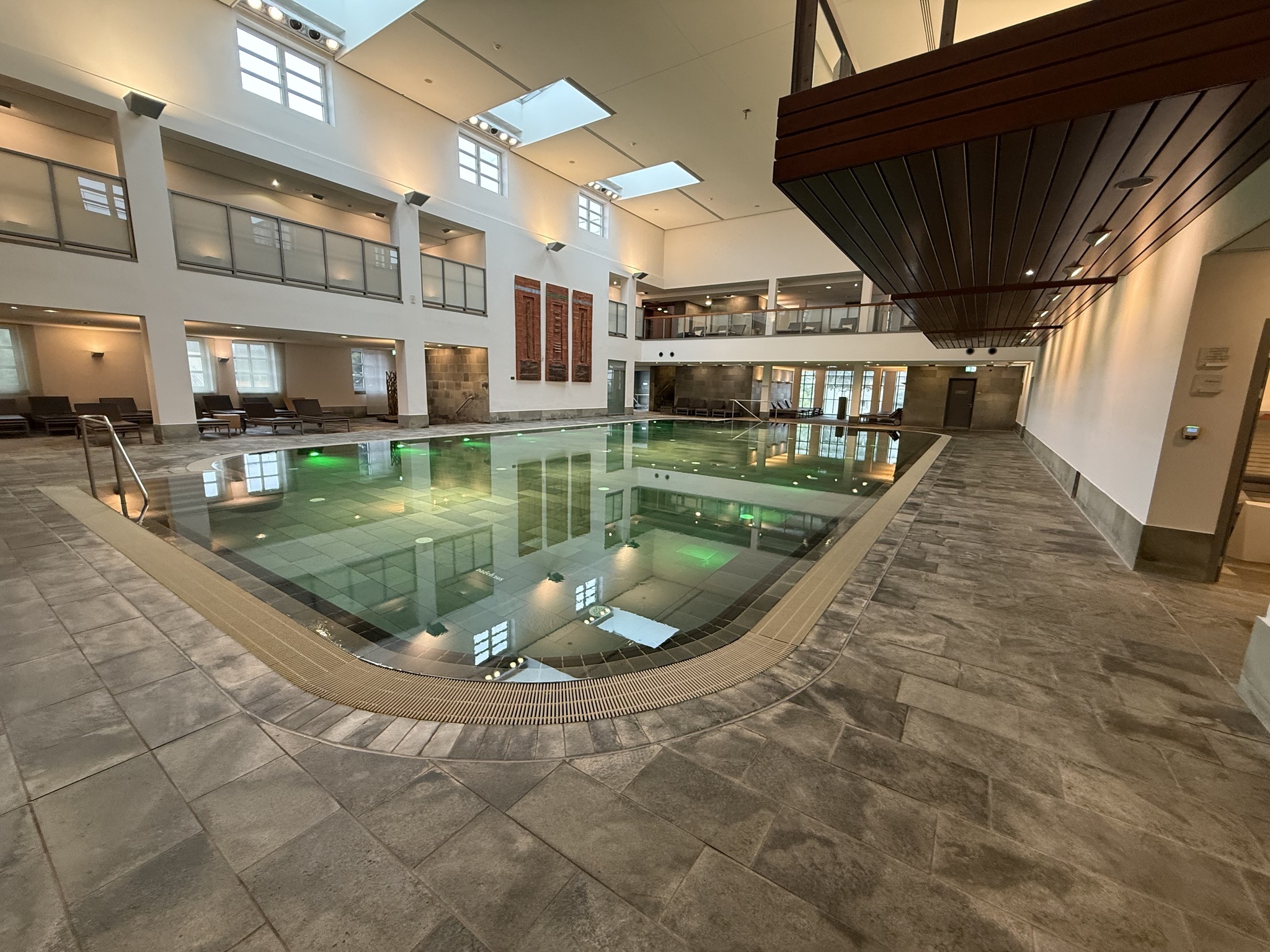 - Zum Einstieg in das Schwimmbecken gibt es einen Personenlift und flache Treppenstufen mit Handlauf.