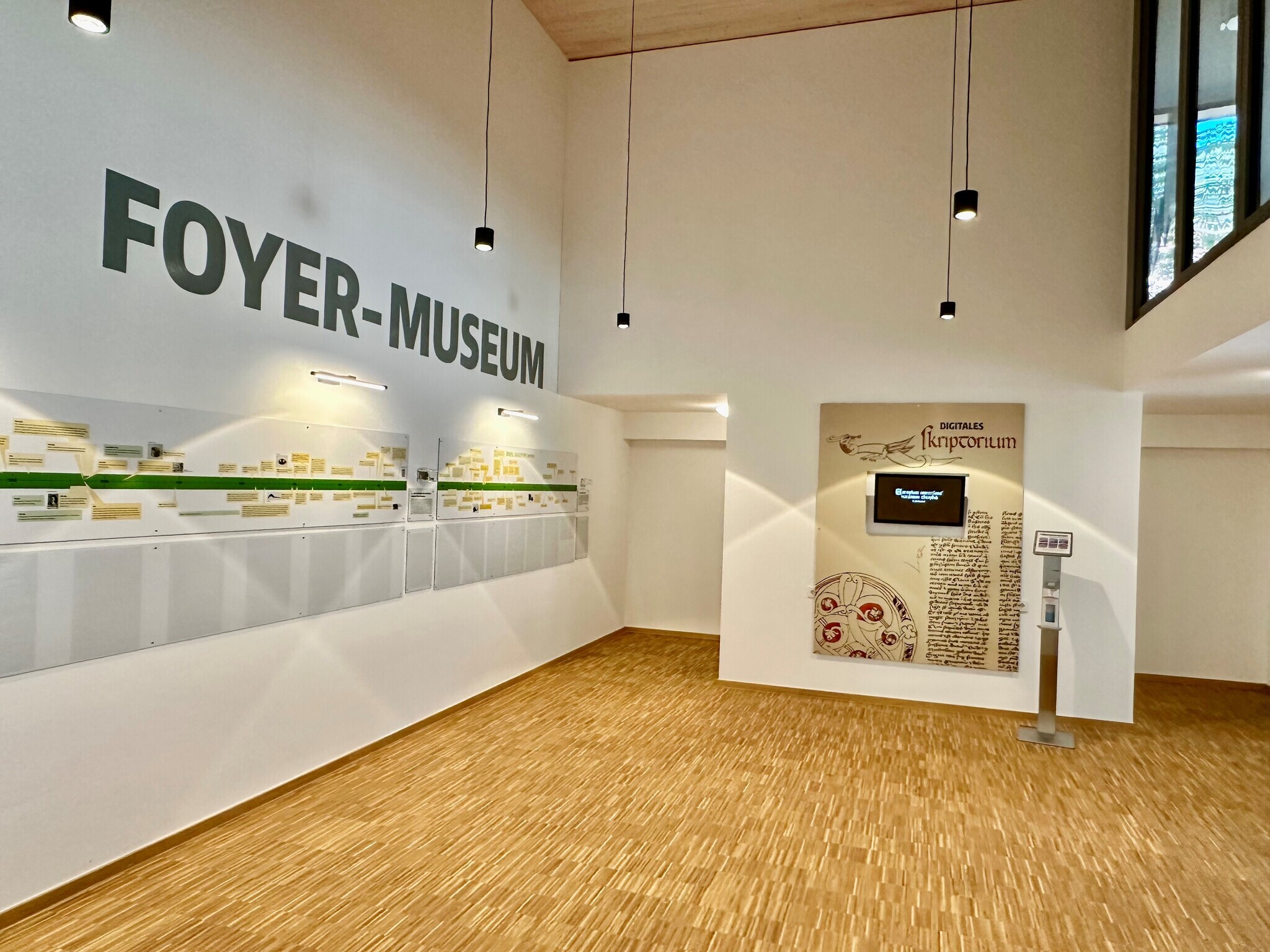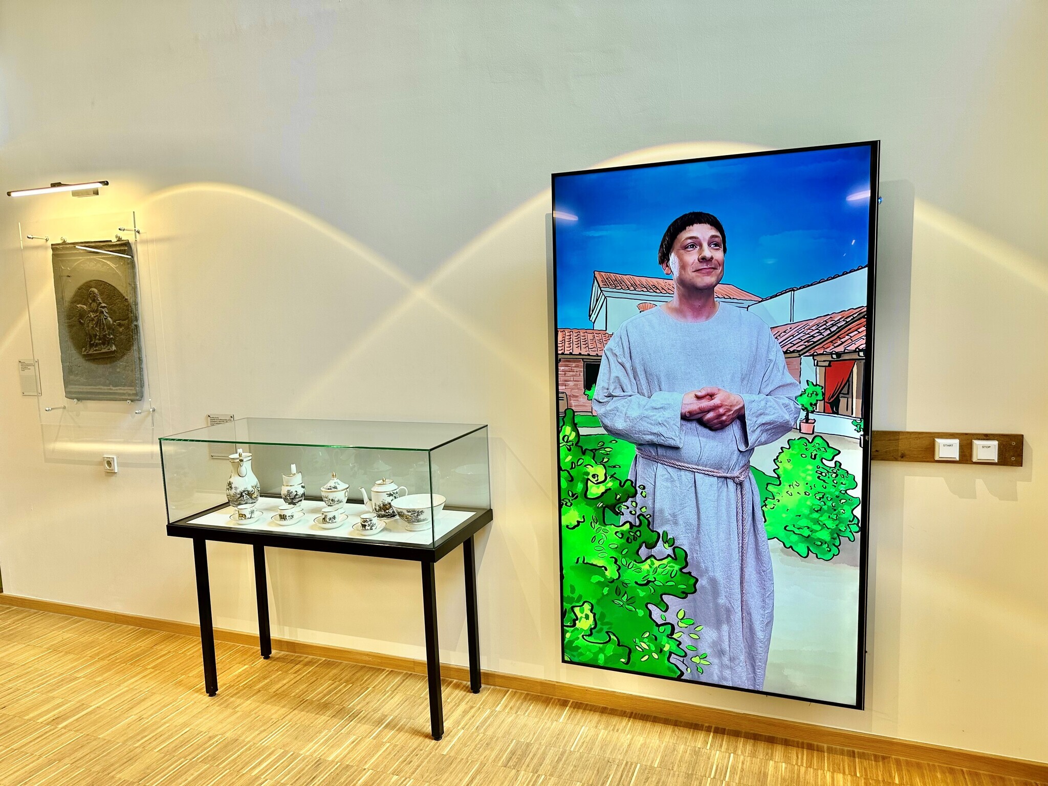 Ausgewählte Exponate - darunter ein Tee-Service aus der Porzellanmanufaktur in Sankt Martin, eine historische Ofenplatte sowie ein Bleiglasfenster mit Motiven des heiligen Martin – runden die Präsentation ab. Das Foyer-Museum verbindet digitale Medien, historische Objekte und künstlerische Interpretation zu einem spannenden Einblick in die Geschichte des Martinsklosters.