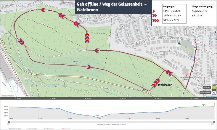 Grüne Streuobstwiesen und lichte Wälder. Wandern in der sanften Landschaft des Nordschwarzwalds ist erholsam und entspannend. Waldbronn hat ein mildes Schon-/Reizklima, die Albtherme ist ein attraktives Gesundheits-und Freizeitzentrum. Ausgangspunkt für den Terrainkurweg "Geh offline" ist der Waldpark. Der Weg ist ganzjährig begehbar, Sonnen- und Schattenbereiche wechseln sich ab. Entlang des Waldsaums führt der gepflegte Waldweg ortsnahe durch ein schattiges Mischwäldchen. Auf dem Terrainkurweg wurde der Themenweg angelegt. Der Weg "Geh offline – Weg der Gelassenheit" gibt mit sechs verschiedenen Stationen ganz besondere Impulse, dabei wechseln sich Aktivität und Innehalten ab. Achtsam durch die Natur gehen, die Sinne schärfen, mit sich selbst in Kontakt kommen und dabei „offline gehen“ ist ein Weg zu mehr Gelassenheit.