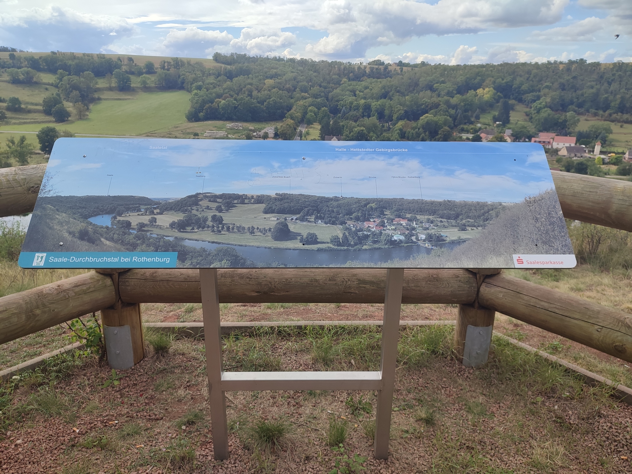 Von hier oben kann man das Nebeneinander der Hangbereiche mit einem Vegetationsmosaik aus Halbtrockenrasen, Fels- und Gehölzstrukturen und der durch Acker, Wiesen und Obstbäume geprägten Talaue erkennen und den Lauf der Saale verfolgen. Der Blick in die hier noch erkennbare historische Kulturlandschaft mit Hangterrassen, Streuobstwiesen und Auengrünland ist einzigartig.