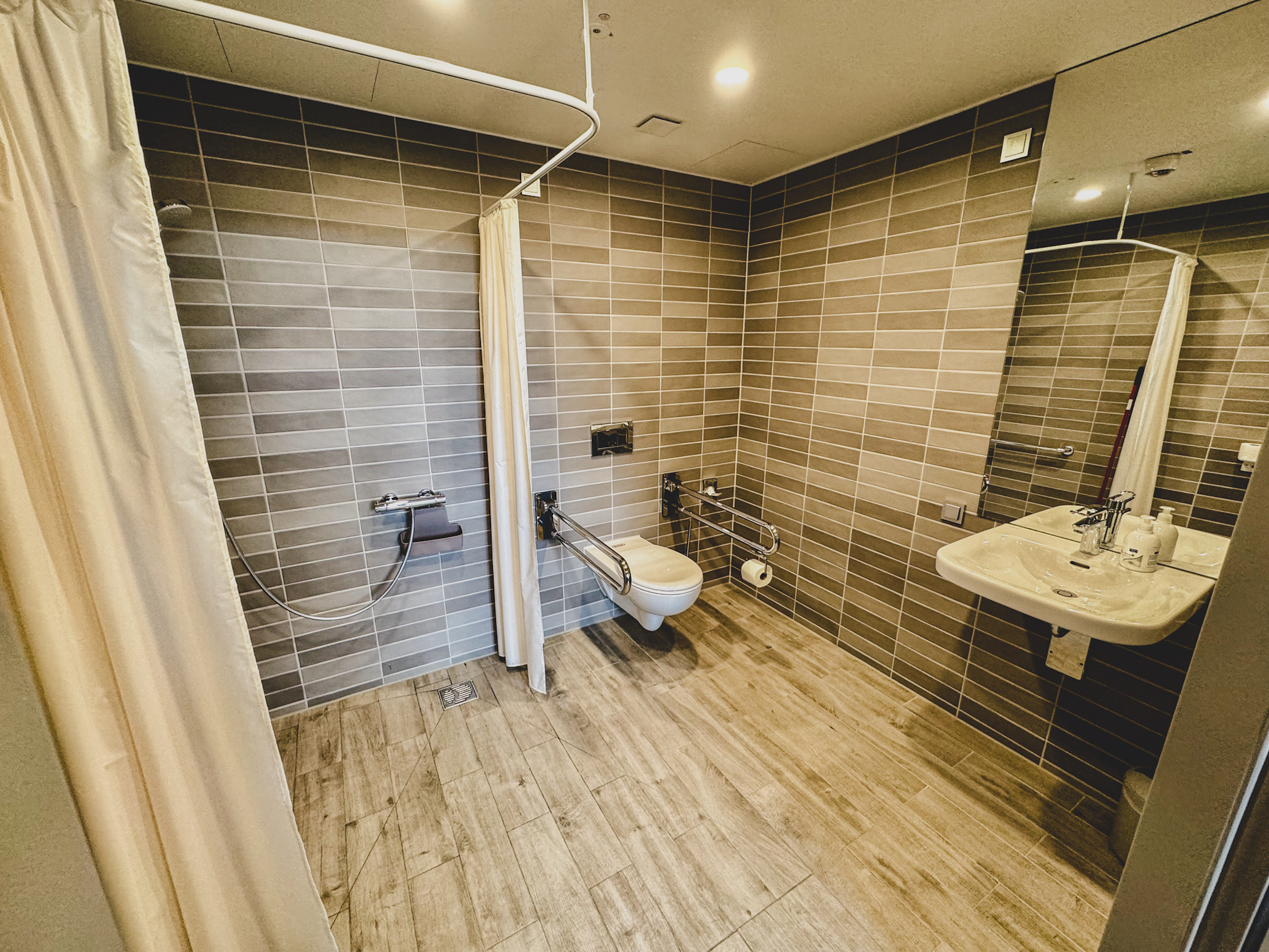 • Das WC auf dem Zimmer ist von einer Seite aus anfahrbar (mindestens 80 cm). Es sind links und rechts klappbare Haltegriffe vorhanden.