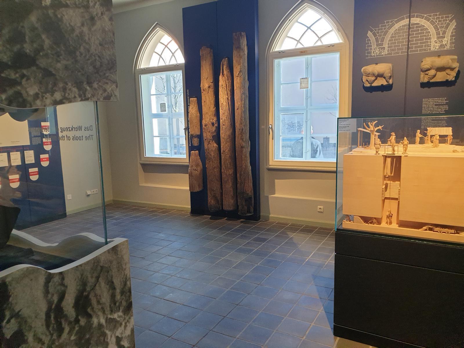 - In den Ausstellungsräumen sind Hindernisse, z. B. in den Weg/Raum ragende Gegenstände, vorhanden: Vitrinen, Exponate