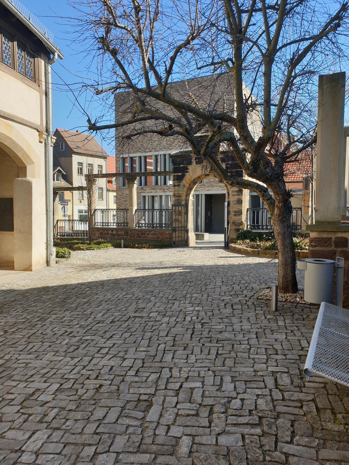- Das Erdgeschoss im Altbau ist vom Neubau aus stufenlos zugänglich. Hier gibt es zwei kleine Ausstellungsräume, die nur über Stufen erreichbar sind.