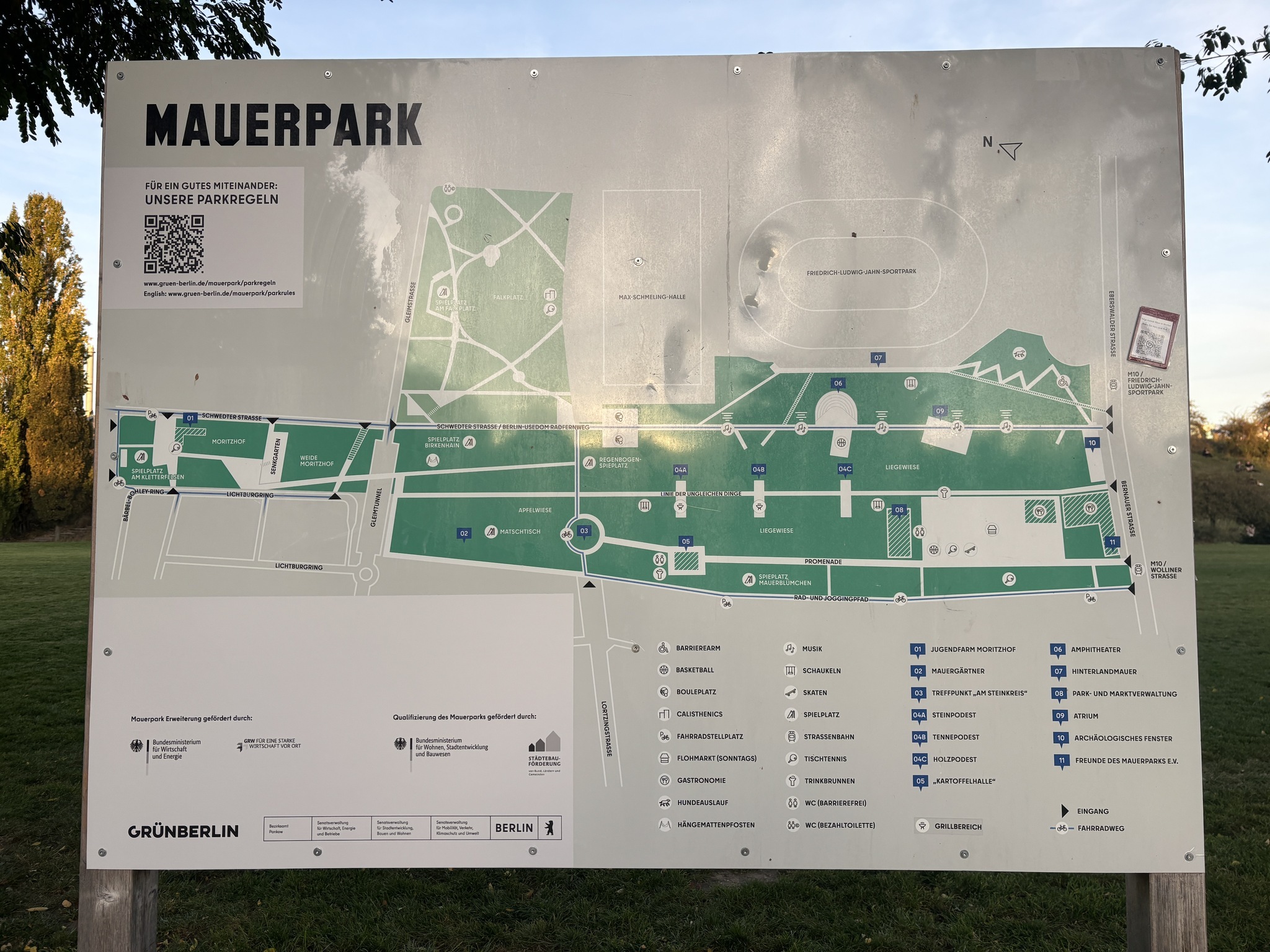 Während die großen Berliner Volksparks des 19. Jahrhunderts von den Regierenden für die Bevölkerung geplant wurden, eigneten sich die Anwohnenden den Mauerpark im einstigen Grenzstreifen nach dem Mauerfall selbst an. Daher ist seine Kultur von kreativen Initiativen geprägt, die nach und nach zu lokalen Traditionen wurden – vom Flohmarkt bis zur Graffitiwand. Vor allem an Sonntagen ist hier immer viel los. Dank verschiedener Erweiterungen über die Jahre ist der Mauerpark zudem auf inzwischen mehr als 140.000 Quadratmeter angewachsen. So bietet er im dicht besiedelten Prenzlauer Berg eine willkommene Möglichkeit, sich auf einer grünen Wiese zu entspannen.