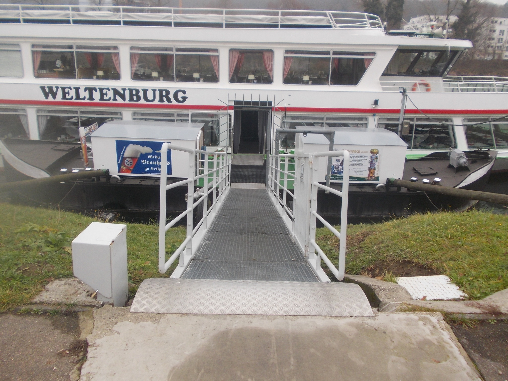 - Der Zugang zur MS „Weltenburg“ erfolgt über eine 9 m lange Rampe (Laufsteg) mit 22 % Längsneigung und einer Breite von 103 cm (Neigung abhängig vom Wasserstand). Beidseitige Handläufe sind vorhanden.