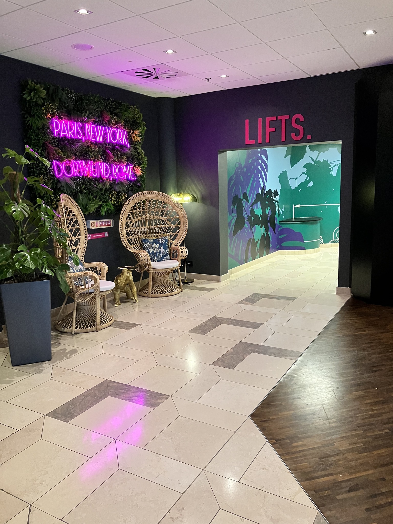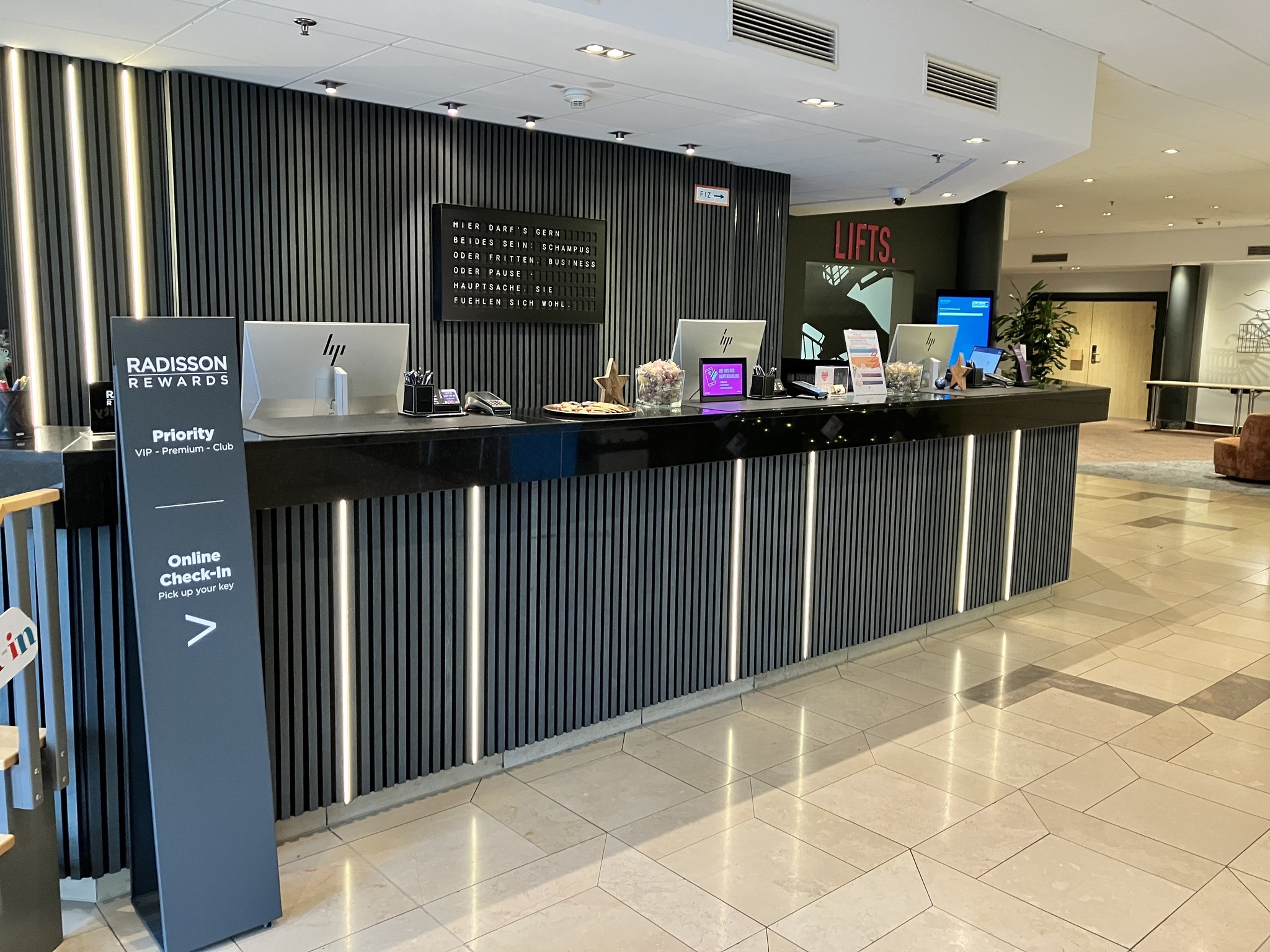 - Es gibt keinen abgesenkten Rezeptionstresen. Es ist jedoch eine andere, gleichwertige Kommunikationsmöglichkeit im Sitzen vorhanden.