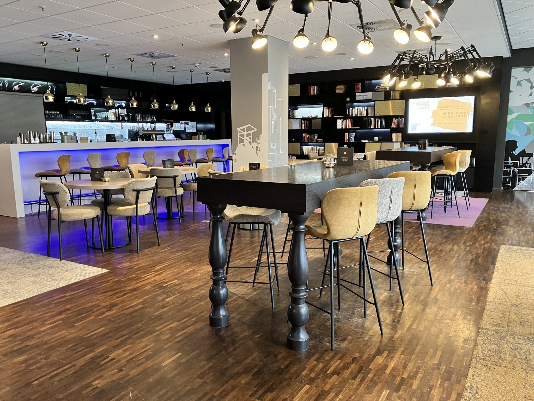 - Im Frühstücksraum und in der Bar sind Tische mit heller und blendfreier Beleuchtung vorhanden, an denen keine Lampen stehen oder hängen, die das Gesichtsfeld bzw. den Blickkontakt stören.