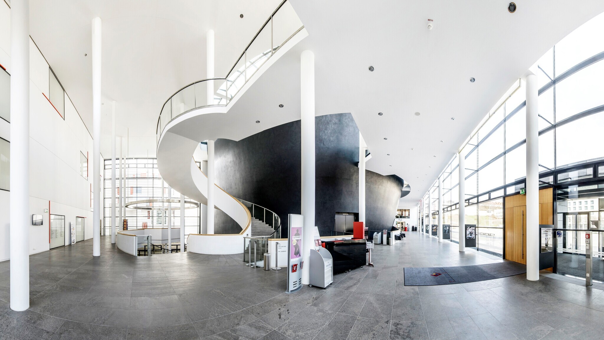 - Der Theatereingang zum Foyer ist stufen- und schwellenlos erreichbar. Die Eingangstür wird ohne eigenen Kraftaufwand (Drücker, Lichtschranke, Bewegungsmelder etc.) geöffnet.