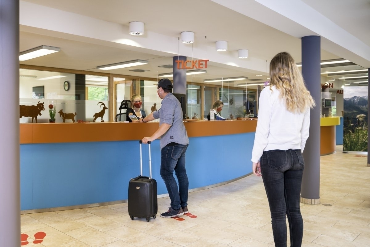 Der Haupteingang der Tourist- Information verfügt über einen barrierefreien Zugang. Ob Jung oder Alt und mit oder ohne Handicap – jede*r ist herzlich Willkommen. Die Mitarbeiter*innen sind sensibilisiert und kommen gerne dem Gast bei der Beratung an einem eigenen Beratungstisch entgegen. An digitalen Touch-Displays kann sich der Gast auf der Oberstdorf App über Ausflugs- oder Veranstaltungstipps und Aktivitäten informieren. Auch Gäste mit einer Höreinschränkung können über ein mobiles Ringschleifensystem an einem eigens ausgestatteten Arbeitsplatz beraten werden. Das Gerät minimiert die Nebengeräusche, wodurch die Beratungsqualität verbessert wird.