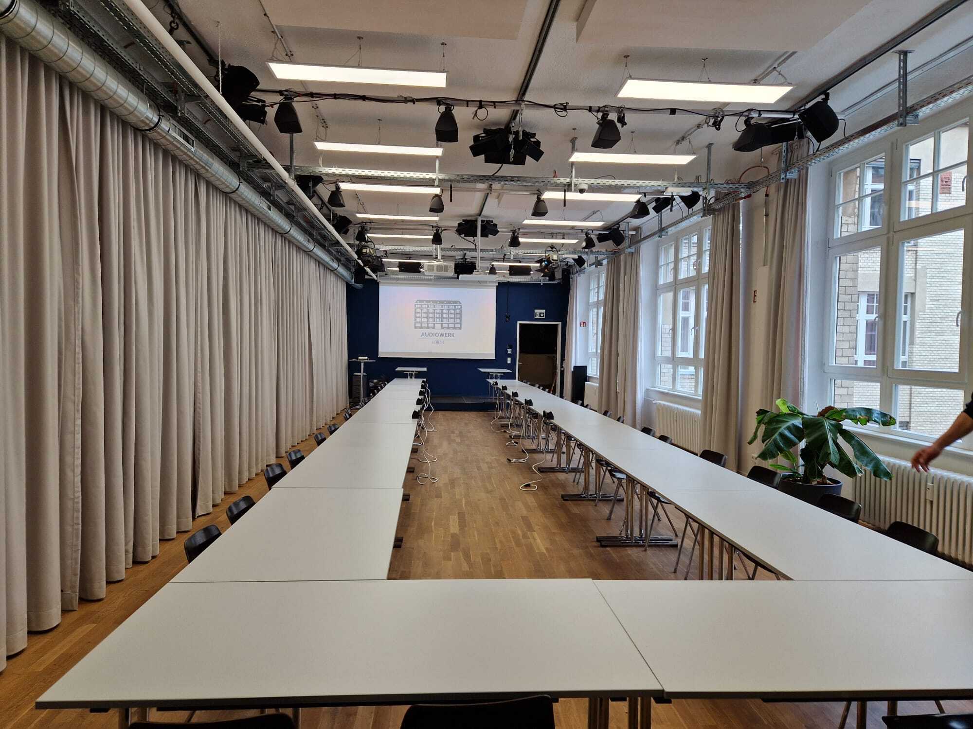 Das AUDIOWERK BERLIN gibt es seit September 2020 und ist als Event-Location ein Geschäftsbereich der IT AUDIO GmbH und trägt seit 2024 das Nachhaltigkeitszertifikat 'High Performer'. Das AUDIOWERK überzeugt mit exzellenter Medientechnik, einem großen hellen Seminarraum (ca. 140 m2) für unterschiedliche Arten von Veranstaltungen bis zu 120 Personen, einer geräumigen vollausgestatteten Eventküche (ca. 60 m2), einer Lounge, einem Konferenzraum und mehreren Coworking Spaces. Wir haben die Räume, in der ehemaligen Maggi- Fabrik (Baujahr 1911) im Herzen Berlins, stilvoll, einladend und technisch auf höchstem Niveau saniert und ausgestattet. In unserer unmittelbaren Nähe, in der Lützowstr. 102-104, 10785 Berlin, befinden sich wichtige kulturelle Orte, wie das Varieté Theater Wintergarten, das Kulturforum mit der Neuen Nationalgalerie, die Philharmonie, die Gemäldegalerie sowie das legendäre Kumpelnest 3000. Ebenso in der Nähe befindet sich der Potsdamer Platz. Die Anbindung an öffentliche Verkehrsmittel ist mit Bus und Bahn ohne Weiteres gut möglich und Tag und Nacht garantiert.