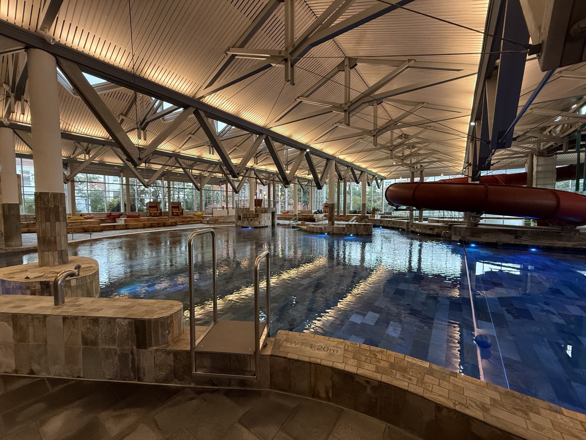 - Zum Einstieg in das Spaßbad auf der Thalassoebene gibt es eine Rampe, flache Treppenstufen mit Handlauf und eine Leiter mit Handlauf.