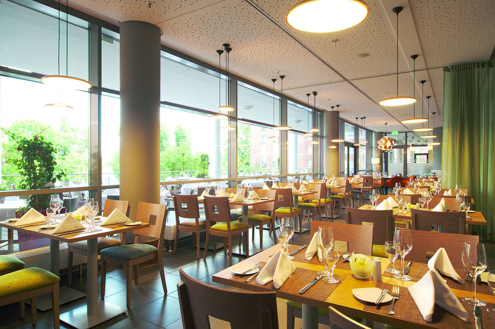 - Im Frühstücksraum und im Bistro "Brennbar" sind Tische vorhanden, die max. 80 cm hoch und in einer Höhe von 67 cm und einer Tiefe von 30 cm unterfahrbar sind.