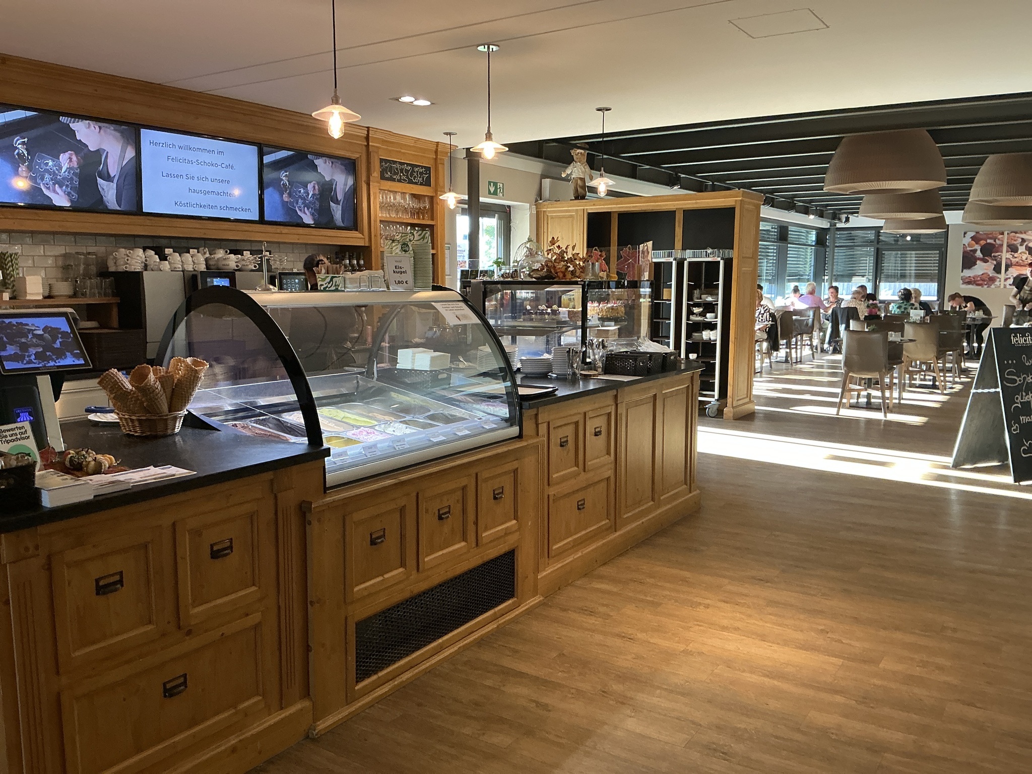 Ruhepunkt im SchokoLadenLand ist das Felicitas-Café mit seinen gemütlichen Stühlen, dem entspannten Blick durch weite Fensterfronten und dem angenehmen Licht aus den "Kakaobohnen-Lampen". Nach einem anregenden Einkauf oder dem interessanten Besuch in der Mitmach-Schauwerkstatt lädt das Café zum Genuss frischer Herrlichkeiten ein. Die hauseigene Konditorei bäckt alles selbst: Ob schokoladige Felicitas-Torte, sommerliche Joghurt-Törtchen oder knackige Nuss-Schnitten, das Café möchte Sie auch mit der Patisserie verwöhnen. Das hausgemachte Eis kennen viele ja schon. Nun können sie es auch in tollen Eisbechern genießen.