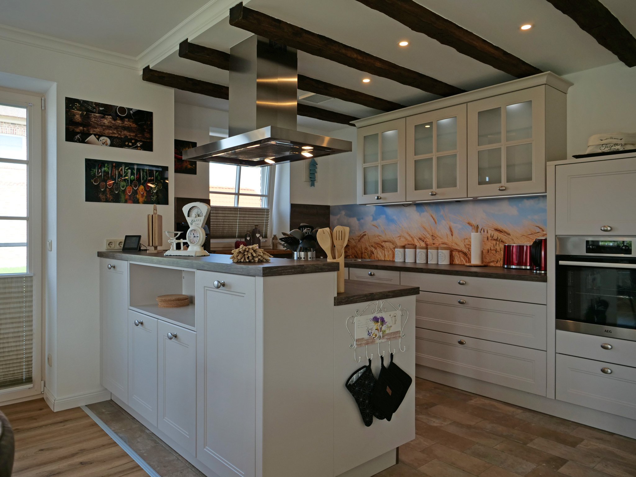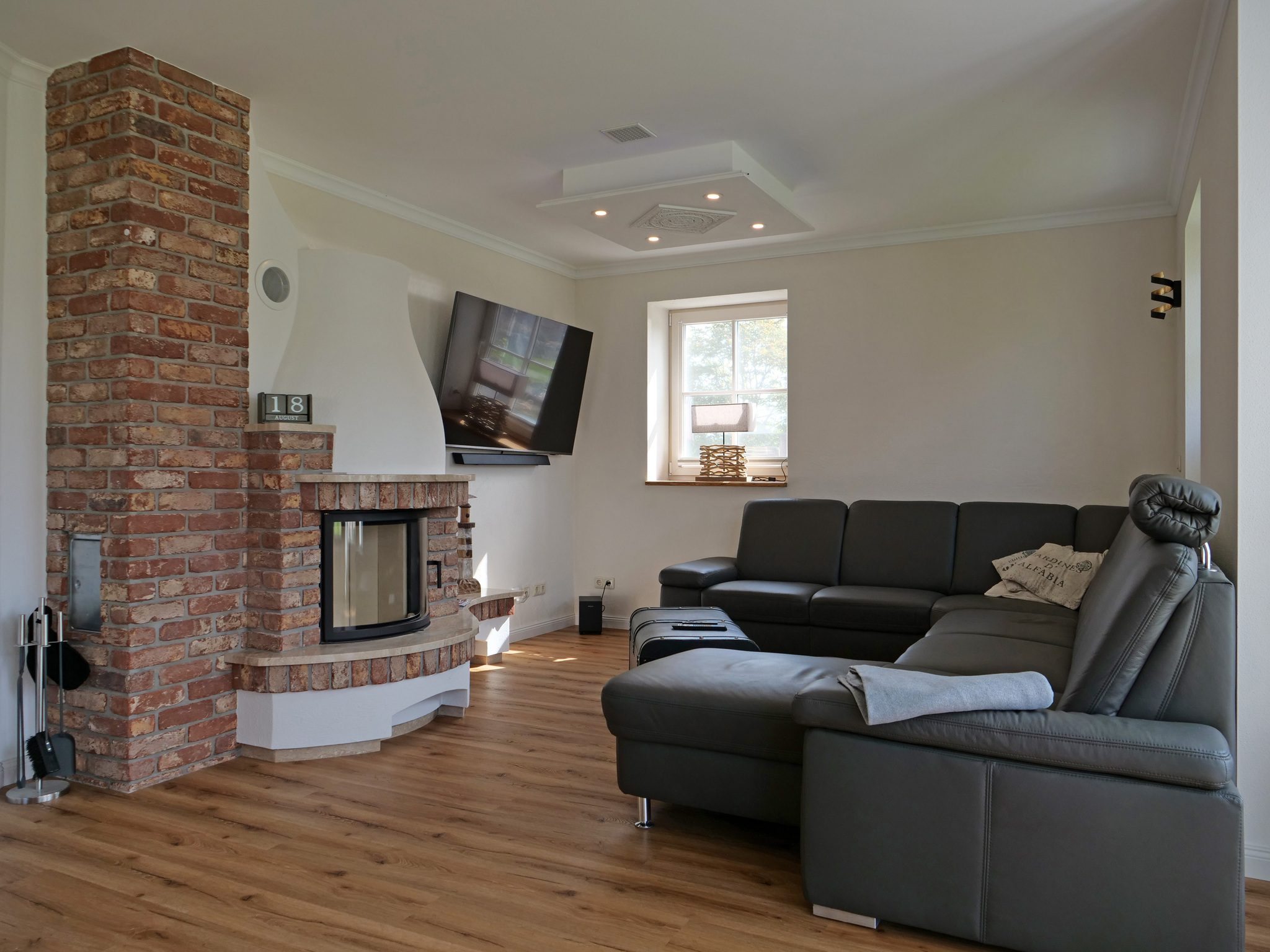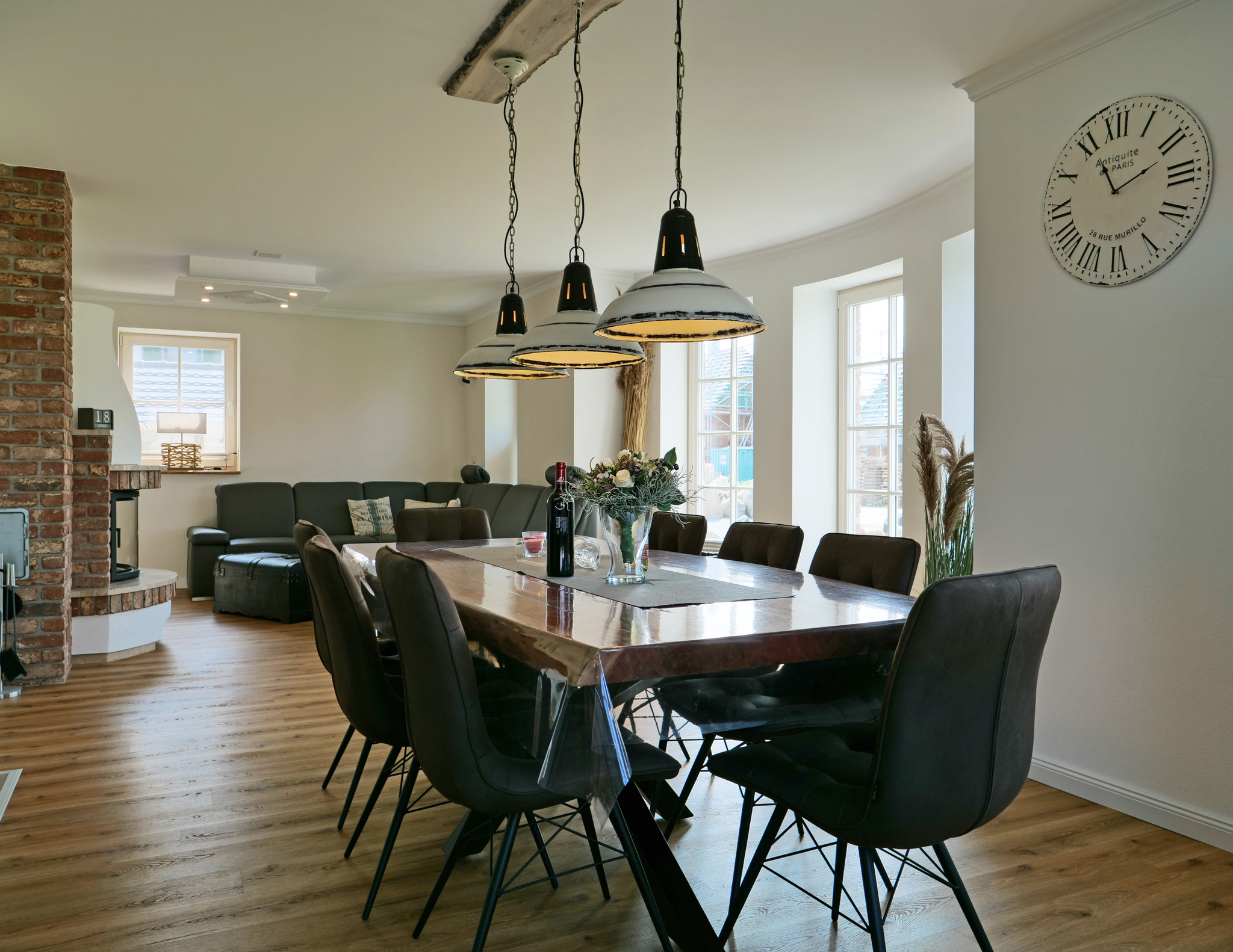 Der großzügige Wohn- und Essbereich lädt zum gemeinsamen Kochen, Spielen und Entspannen ein. Ein Kamin sorgt dabei besonders in der kühleren Jahreszeit für behagliche Gemütlichkeit. Die moderne Landhausküche lässt keine Wünsche offen und bietet alles für entspannte Urlaubstage.