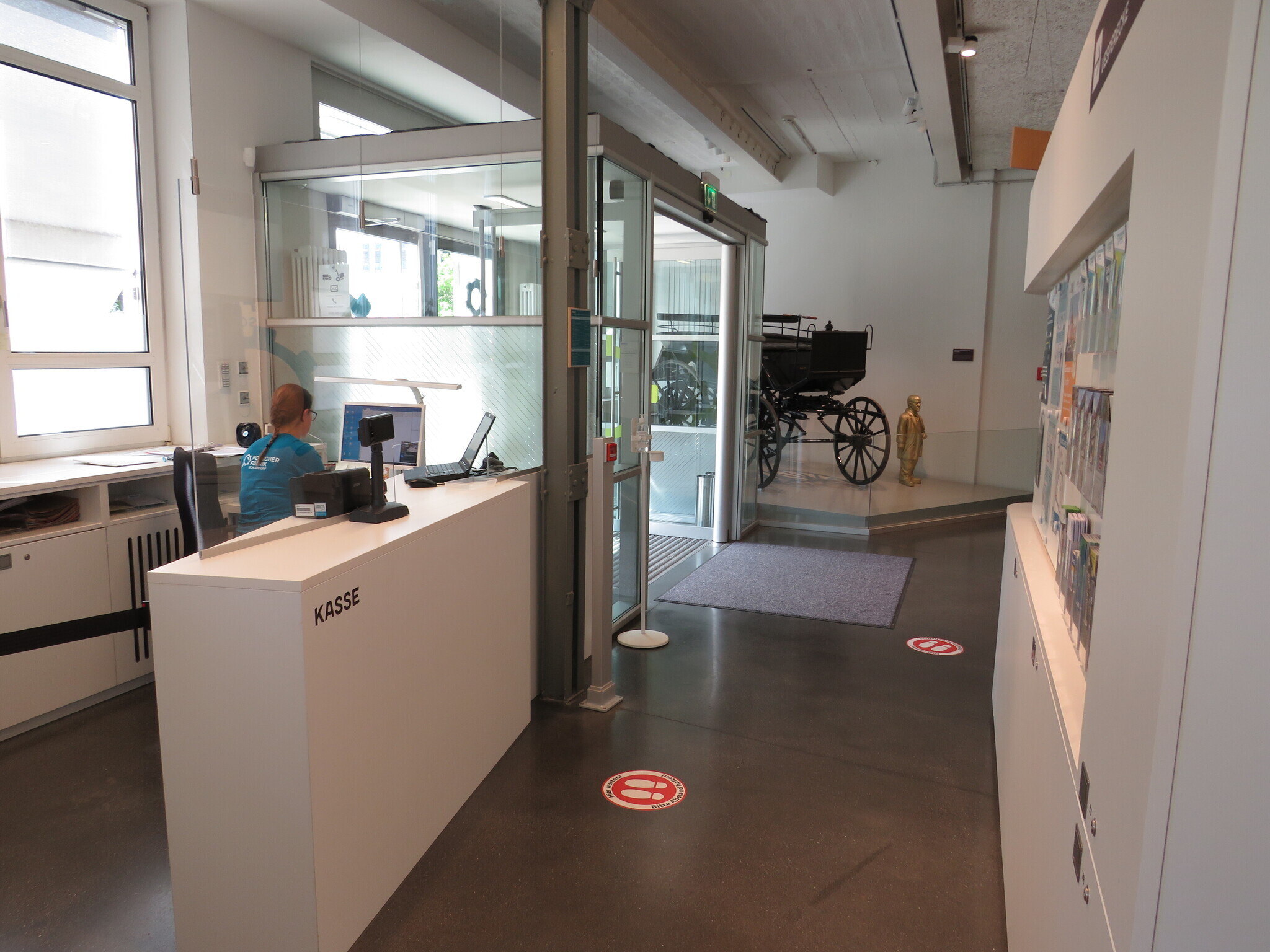 - Der Schalter/Kassentresen ist 100 cm hoch. Es gibt eine alternative Möglichkeit der Kommunikation im Sitzen.