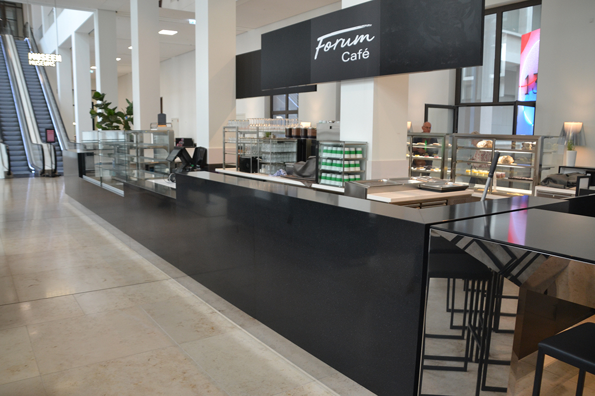- Im Café sind Tische vorhanden, die max. 80 cm hoch und in einer Höhe von 67 cm und einer Tiefe von 30 cm unterfahrbar sind.