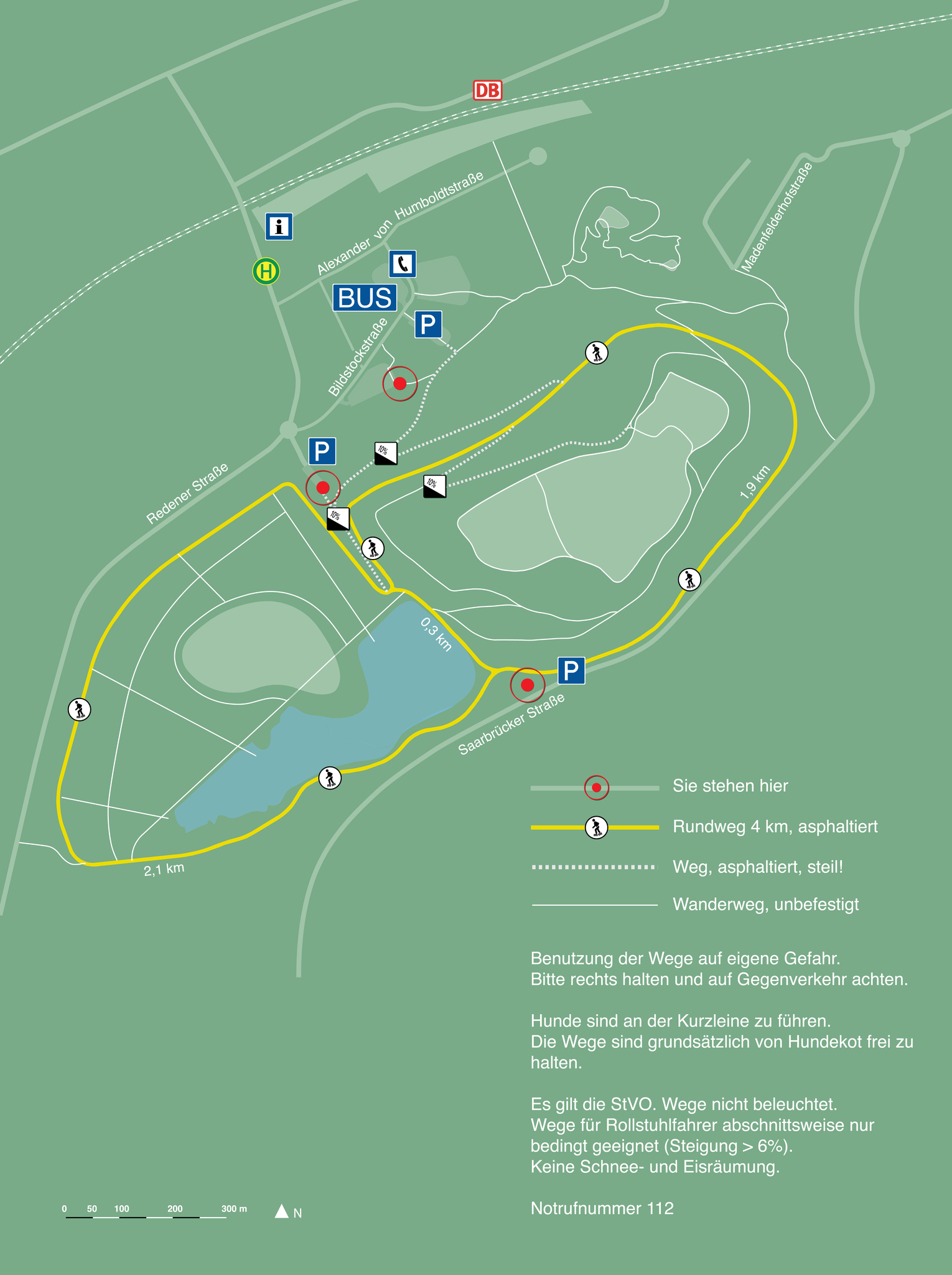 Vier Kilometer lang ist der Freizeit- und Skaterweg rund um die Redener Halde und den Brönchesthalweiher.