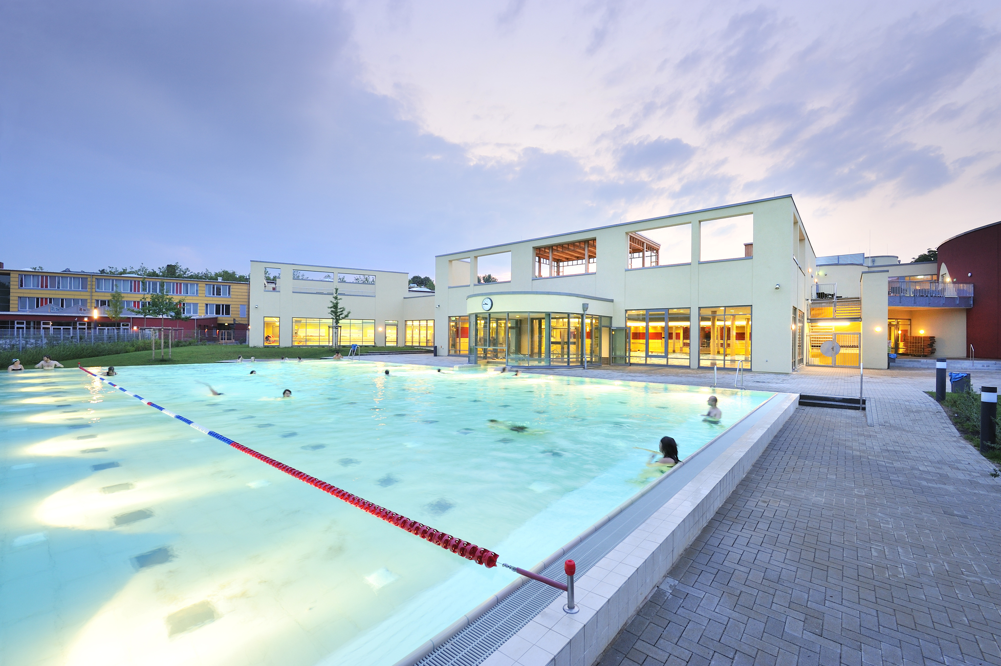 - Zum Einstieg in die Becken gibt es einen Personenlift, Leitern mit Handlauf und flache Treppenstufen mit Handlauf.