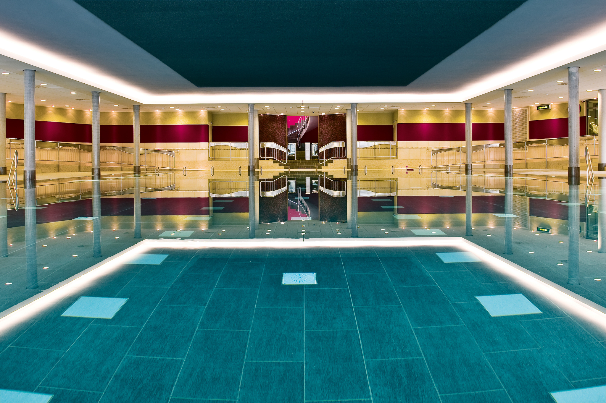 - Zum Einstieg in die Schwimmbecken gibt es einen Personenlift, flache Treppenstufen mit Handlauf und eine Leiter mit Handlauf.