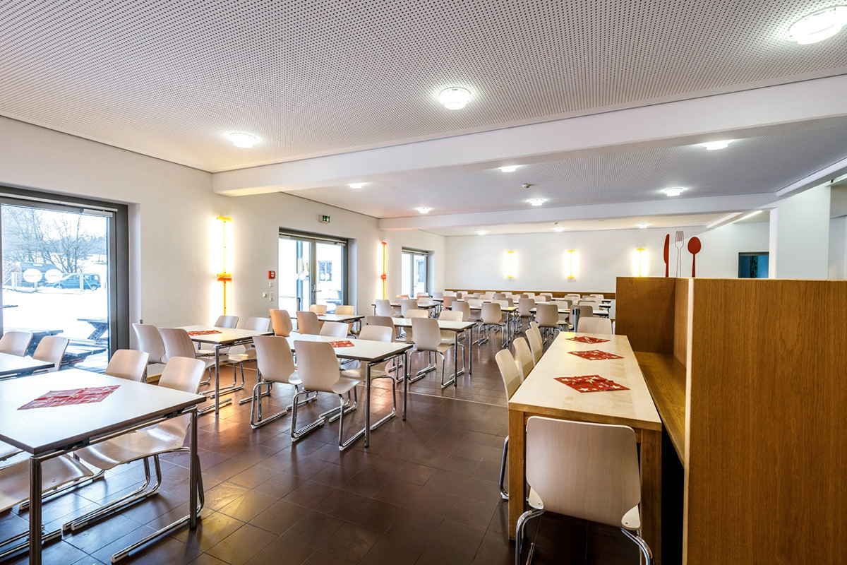 - Im Speiseraum sind Tische mit heller und blendfreier Beleuchtung vorhanden, an denen keine Lampen stehen oder hängen, die das Gesichtsfeld bzw. den Blickkontakt stören.