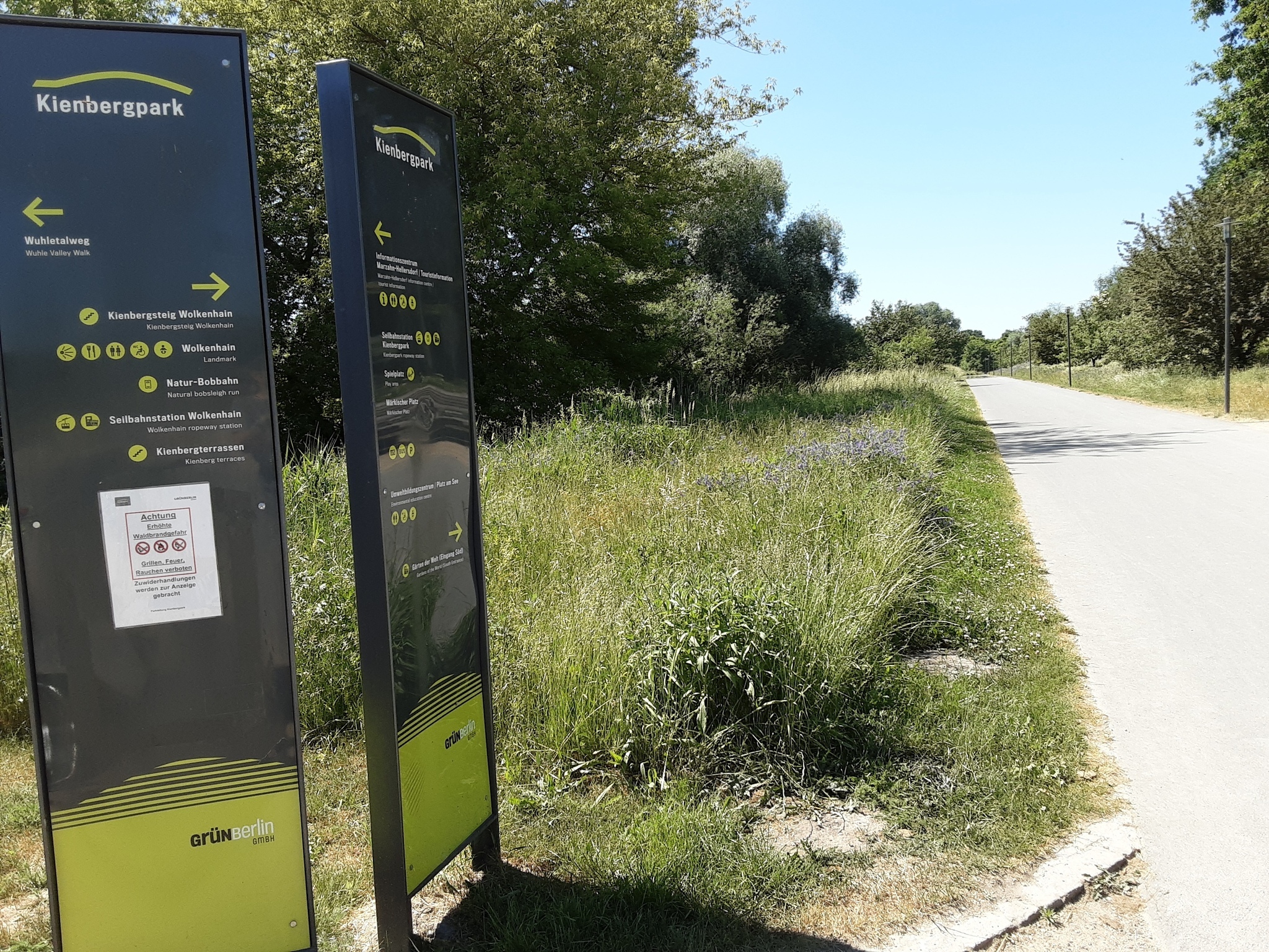 - Name bzw. Logo des Kienbergparks sind nicht an allen Zugängen klar erkennbar.