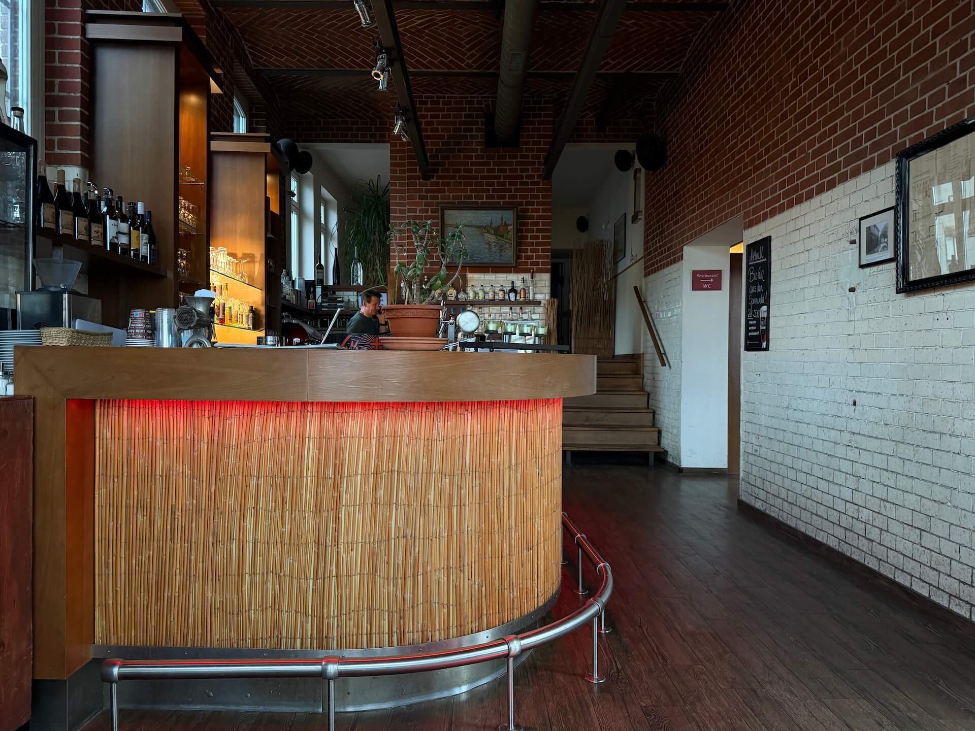 - Bei der Treppe zwischen Bar und Lounge sind keine kontrastreichen Stufenflächen vorhanden. Ein einseitigen Handlauf ist vorhanden.