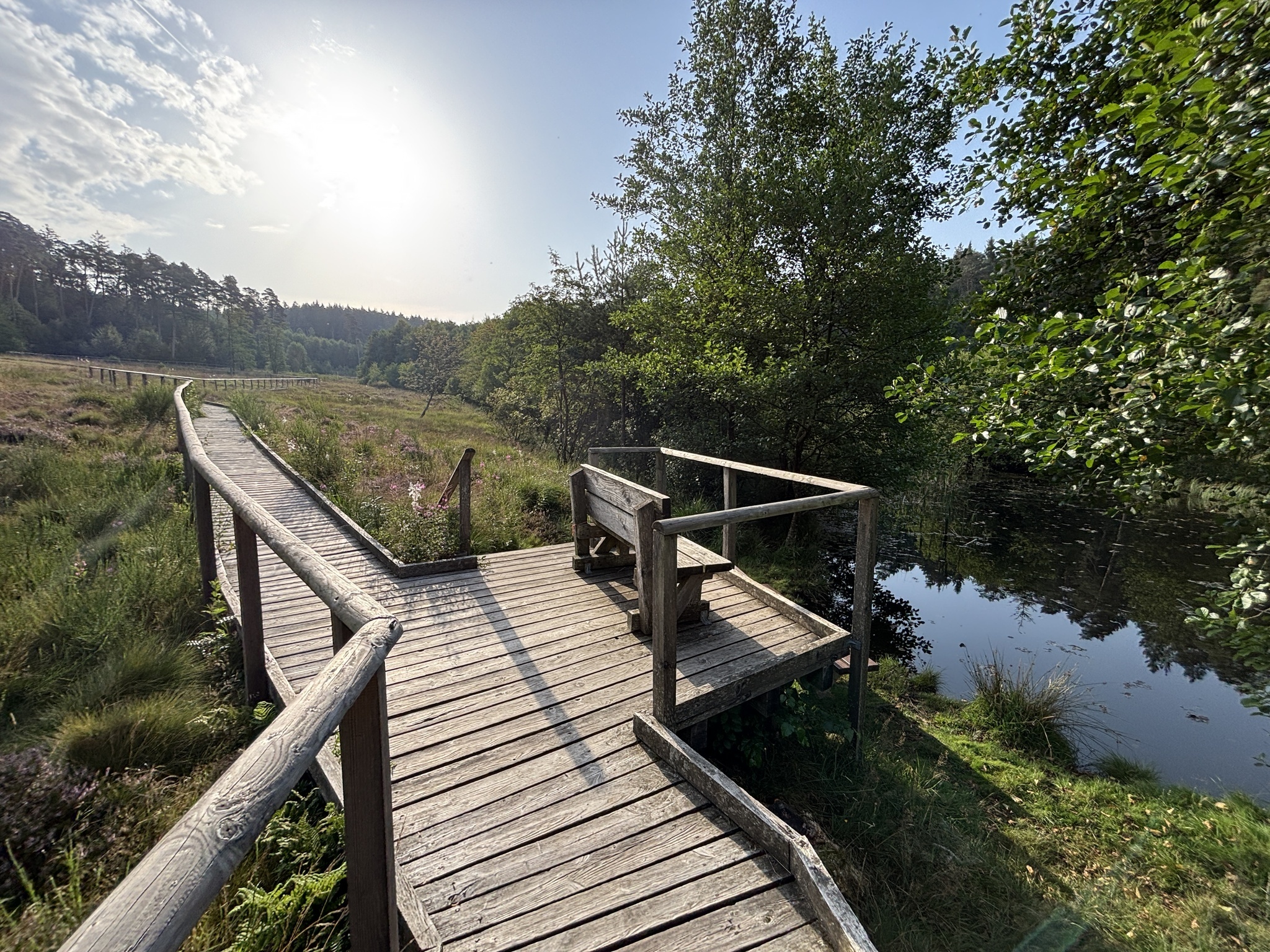 - Es handelt sich um einen Holzbohlenweg, der mindestens 108 cm breit ist. In Sichtweite sind größere Begegnungsflächen, so dass einander ausgewichen werden kann.