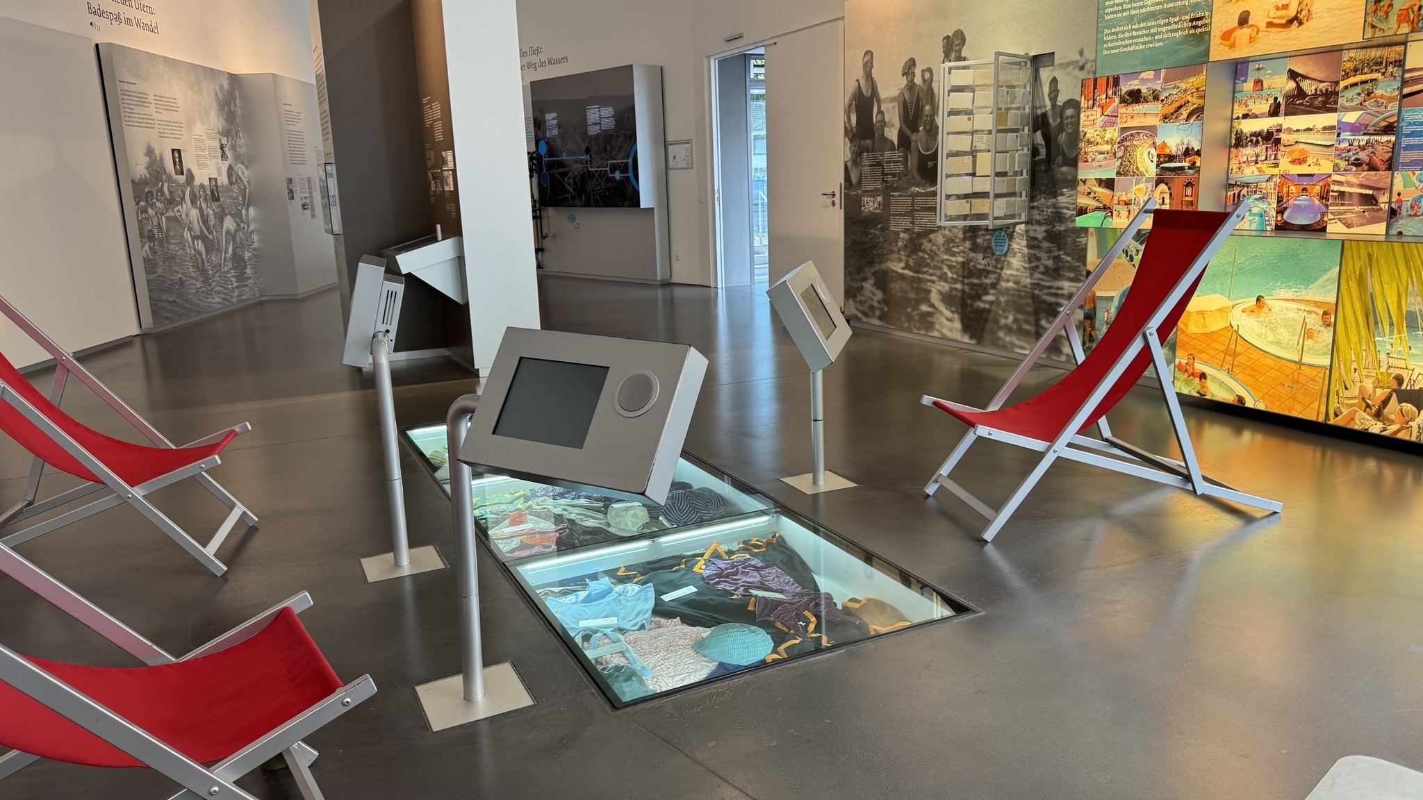 - Die Exponate und die Informationen zu den Exponaten sind überwiegend im Sitzen sichtbar. Die interaktive Medienstationen sind überwiegend unterfahrbar.