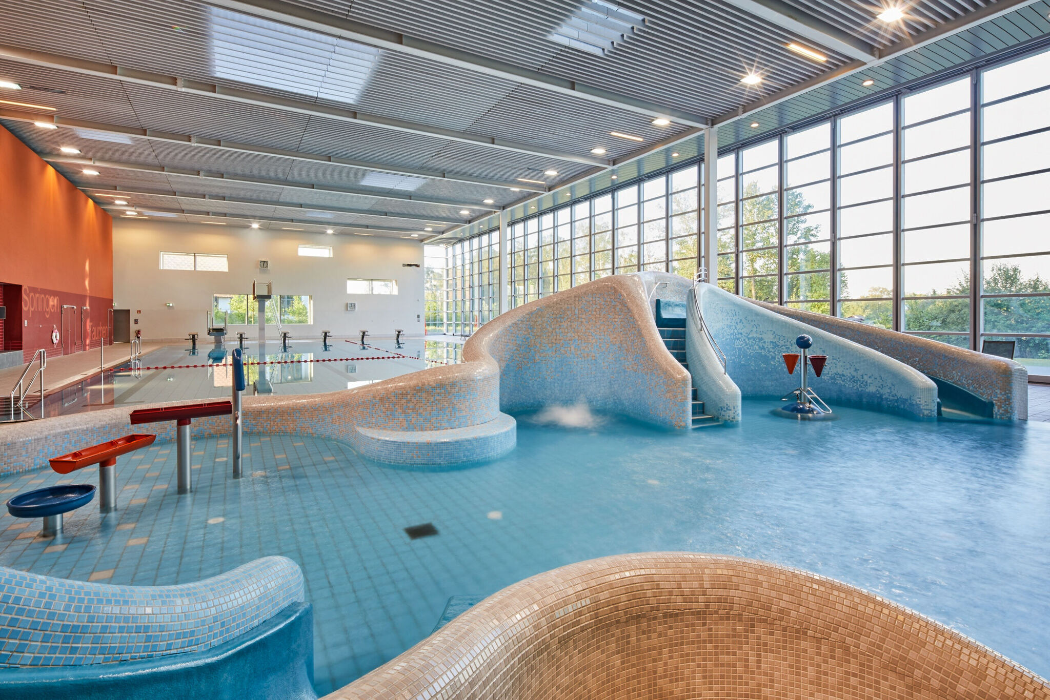 - Zum Einstieg in das Kursbecken gibt es einen Personenlift, flache Treppenstufen mit Handlauf und eine Leiter mit Handlauf.