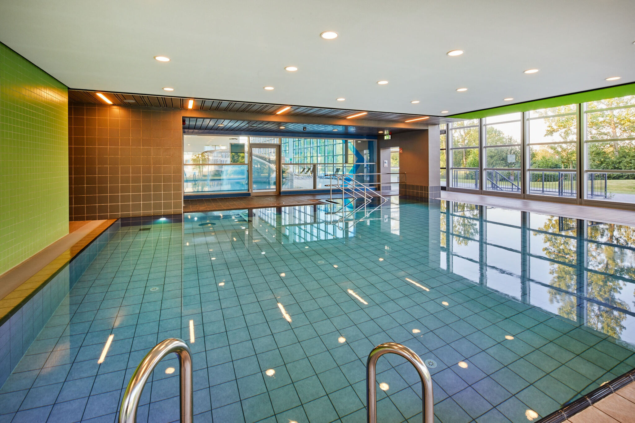 - Zum Einstieg in das Schwimmbecken gibt es flache Treppenstufen mit Handlauf und eine Leiter mit Handlauf.