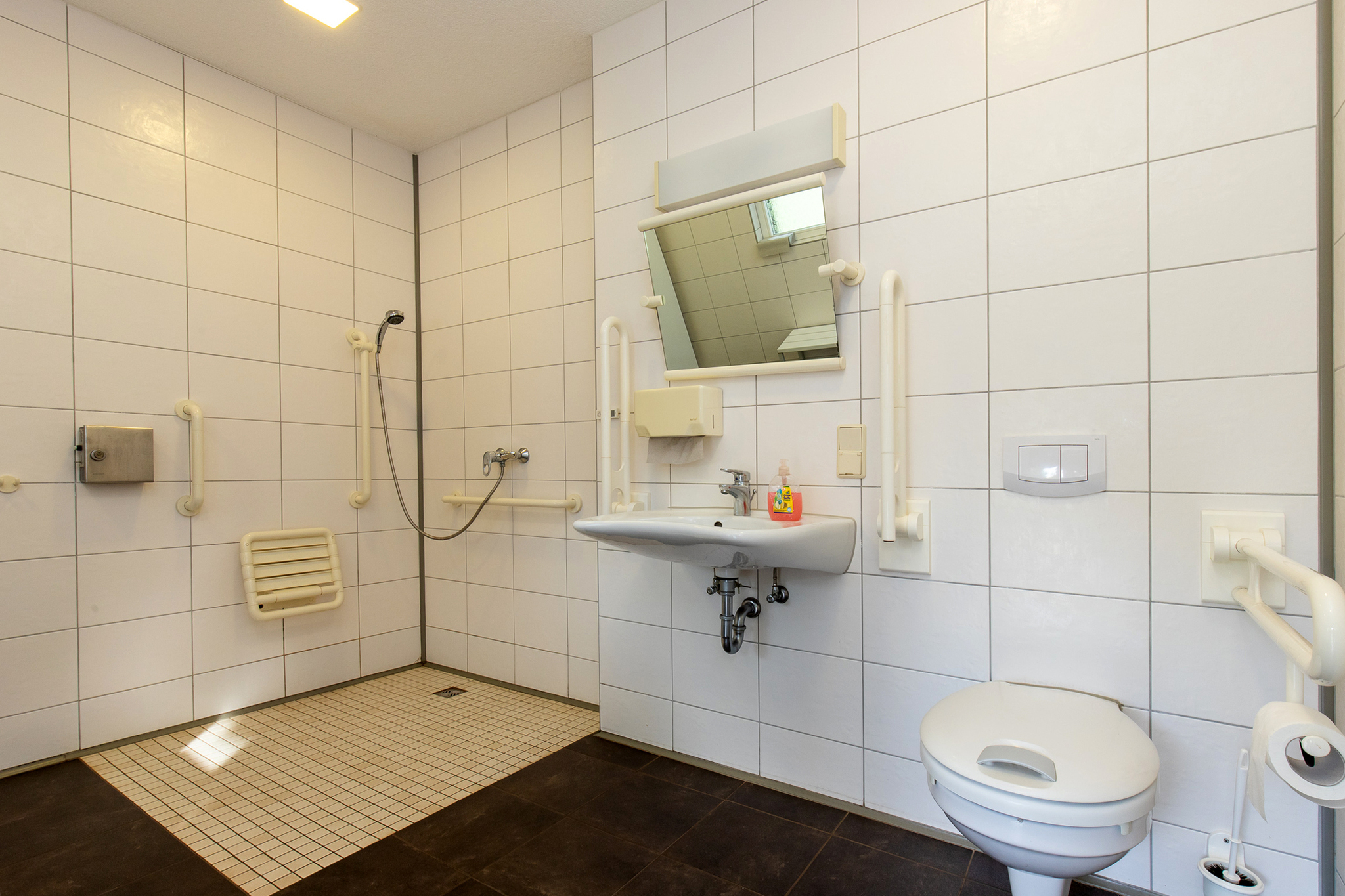 - Der Zugang zur Dusche erfolgt schwellenlos. Ein Haltegriff und ein Duschstuhl sind vorhanden.