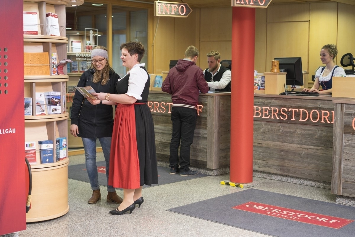 Der Ortsseitige Eingang vom Bahnhofsvorplatz der Tourist- Information verfügt über einen barrierefreien Zugang. Über einen Aufzug ist der Eingang über den Parkplatz zugänglich. Ob Jung oder Alt und mit oder ohne Handicap – jede*r ist herzlich Willkommen. An digitalen Touch-Displays im Innen- und Außenbereich kann sich der Gast auf der Oberstdorf App über Ausflugs- oder Veranstaltungstipps und Aktivitäten informieren. Auch Gäste mit einer Höreinschränkung können über ein mobiles Ringschleifensystem an einem eigens ausgestatteten Arbeitsplatz beraten werden. Das Gerät minimiert die Nebengeräusche, wodurch die Beratungsqualität verbessert wird.