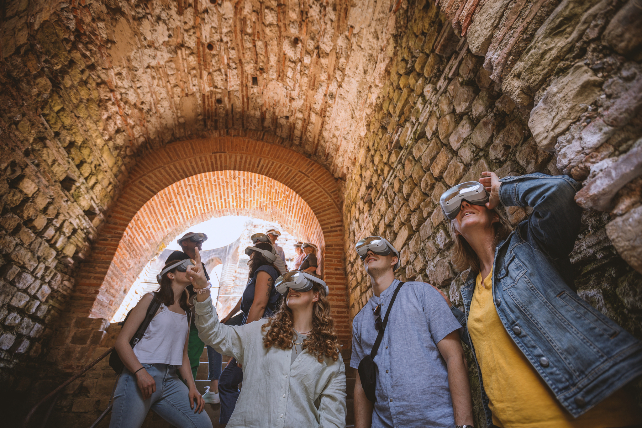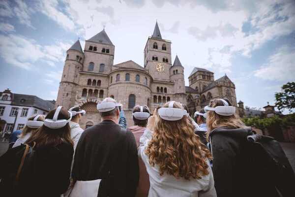 Ein helles Leuchten und technisches Rauschen und auf einmal stehen Sie mitten in den Kaiserthermen. Doch halt – irgendetwas stimmt hier nicht: Wasser plätschert, Menschen waschen sich an den Wasserbecken vor Ihnen und bunt verzierte Wände ragen in die Höhe. Beim Stadtrundgang „Treverer Code“ reisen Sie beim Blick durch die VR-Brille direkt zurück in das antike Trier.