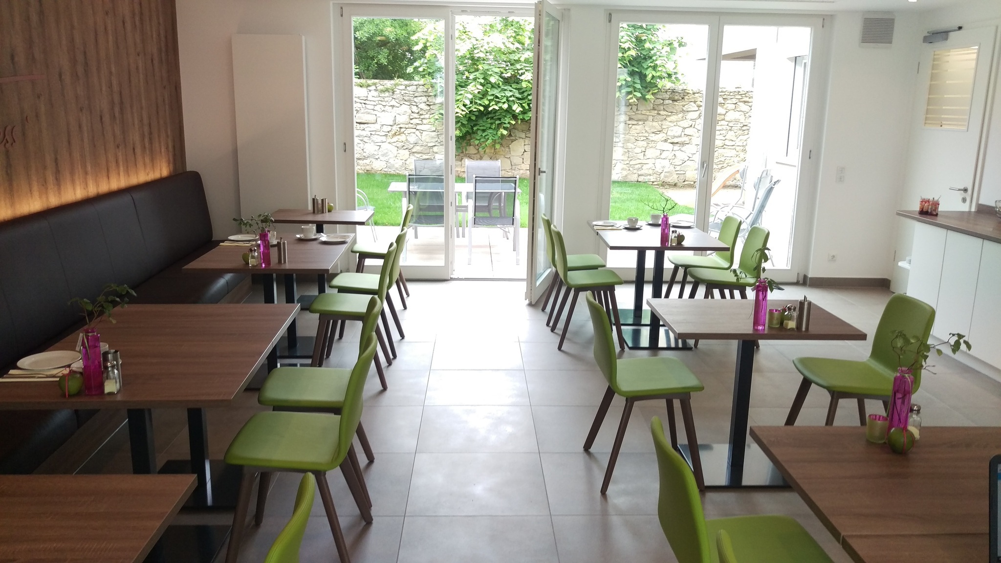 - Im Frühstücksraum sind Tische mit heller und blendfreier Beleuchtung vorhanden, an denen keine Lampen stehen oder hängen, die das Gesichtsfeld bzw. den Blickkontakt stören. Es gibt keinen Sitzbereich mit geringen Umgebungsgeräuschen (z.B. Sitzecke, separater Raum).